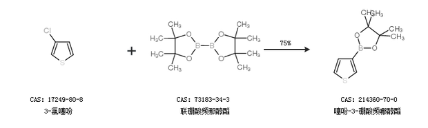 1.通过3-氯噻吩和联硼酸频那醇酯合成噻吩-3-硼酸频哪醇酯,收率约75%;