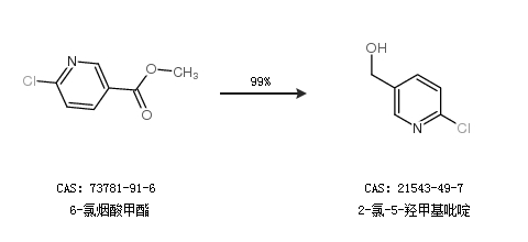 1.通过6-氯烟酸甲酯合成2-氯-5-羟甲基吡啶,收率约99%;