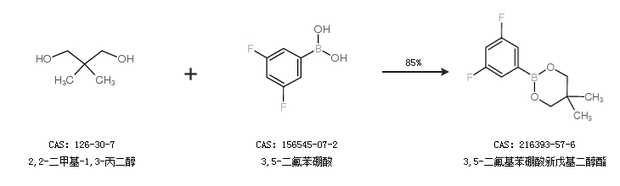 1.通过2,2-二甲基-1,3-丙二醇和3,5-二氟苯硼酸合成3,5-二氟基苯硼酸新戊基二醇酯,收率约85%;
