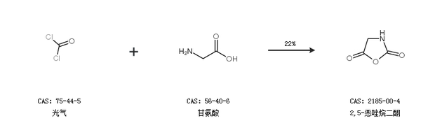 2.通过光气和甘氨酸合成2,5-恶唑烷二酮,收率约22%;