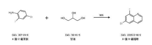 1.通过4-溴-2-氟苯胺和甘油合成6-溴-8-氟喹啉,收率约96%;