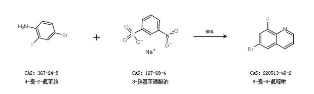 2.通过4-溴-2-氟苯胺和3-硝基苯磺酸钠合成6-溴-8-氟喹啉,收率约98%;