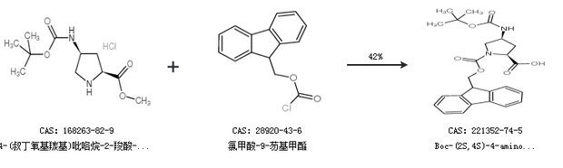 1.通过4-(叔丁氧基羰基)吡咯烷-2-羧酸-(2S,4s)-甲酯和氯甲酸-9-芴基甲酯合成Boc-(2S,4S)-4-amino-1-Fmoc-pyrrolidine-2-carboxylic acid,收率约42%;
