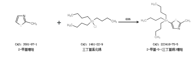 1.通过2-甲基噻唑和三丁基氯化锡合成2-甲基-5-(三丁基锡)噻唑,收率约69%;