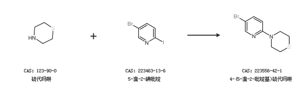 1.通过硫代吗啉和5-溴-2-碘吡啶合成4-(5-溴-2-吡啶基)硫代吗啉