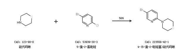 2.通过硫代吗啉和5-溴-2-氯吡啶合成4-(5-溴-2-吡啶基)硫代吗啉,收率约56%;