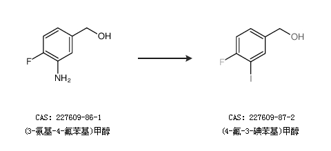 1.通过(3-氨基-4-氟苯基)甲醇合成(4-氟-3-碘苯基)甲醇