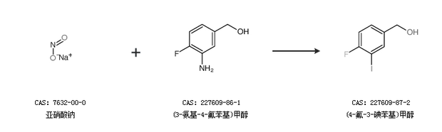 2.通过亚硝酸钠和(3-氨基-4-氟苯基)甲醇合成(4-氟-3-碘苯基)甲醇