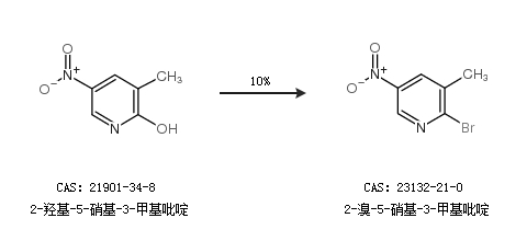 1.通过2-羟基-5-硝基-3-甲基吡啶合成2-溴-5-硝基-3-甲基吡啶,收率约10%;