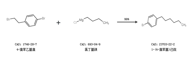 2.通过4-溴苯乙基溴和氯丁基镁合成1-(4-溴苯基)己烷,收率约99%;