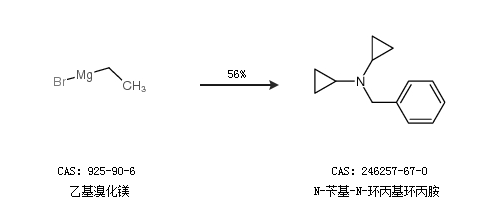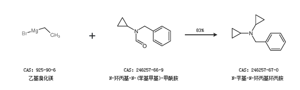 1.通过乙基溴化镁和N-环丙基-N-(苯基甲基)-甲酰胺合成N-苄基-N-环丙基环丙胺,收率约83%;
