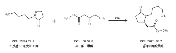 2.通过2-戊基-2-环戊烯-1-酮和丙二酸二甲酯合成二氢茉莉酮酸甲酯,收率约28%;