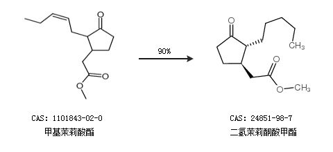 1.通过甲基茉莉酸酯合成二氢茉莉酮酸甲酯,收率约90%;