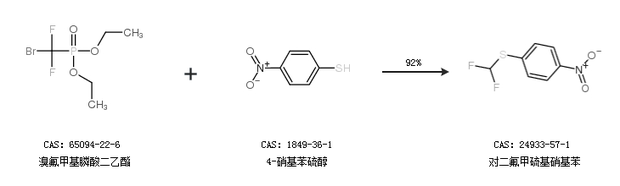 2.通过溴氟甲基膦酸二乙酯和4-硝基苯硫醇合成对二氟甲硫基硝基苯,收率约92%;