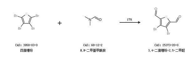 2.通过四溴噻吩和N,N-二甲基甲酰胺合成3,4-二溴噻吩-2,5-二甲醛,收率约17%;
