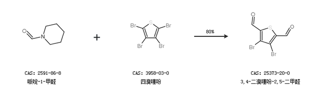 1.通过哌啶-1-甲醛和四溴噻吩合成3,4-二溴噻吩-2,5-二甲醛,收率约80%;