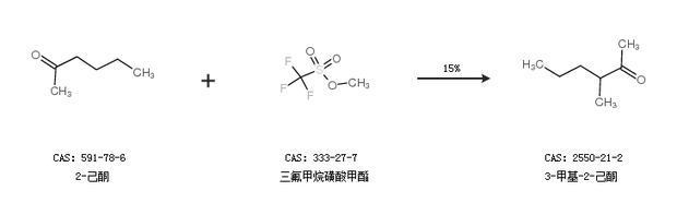 1.通过2-己酮和三氟甲烷磺酸甲酯合成3-甲基-2-己酮,收率约15%;