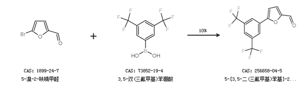 1.通过5-溴-2-呋喃甲醛和3,5-双(三氟甲基)苯硼酸合成5-[3,5-二(三氟甲基)苯基]-2-糠醛,收率约10%;