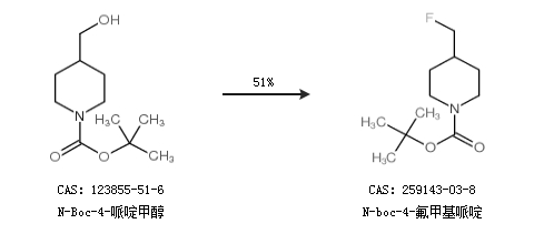 1.通过N-Boc-4-哌啶甲醇合成N-boc-4-氟甲基哌啶,收率约51%;