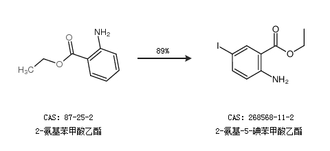 1.通过2-氨基苯甲酸乙酯合成2-氨基-5-碘苯甲酸乙酯,收率约89%;