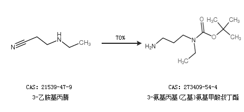 1.通过3-乙胺基丙腈合成3-氨基丙基(乙基)氨基甲酸叔丁酯,收率约70%;