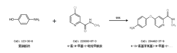 1.通过复硝酚钠和4-氯-N-甲基-2-吡啶甲酰胺合成4-(4-氨基苯氧基)-N-甲基-2-吡啶甲酰胺,收率约99%;