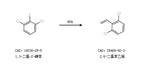 1.通过1,3-二氯-2-碘苯合成2,6-二氯苯乙烯,收率约85%;