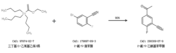 1.通过三丁基(1-乙氧基乙烯)锡和2-氟-5-溴苯腈合成2-氟-5-乙酰基苯甲腈,收率约90%;
