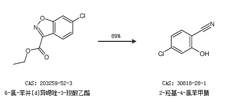 2.通过6-氯-苯并[d]异噁唑-3-羧酸乙酯合成2-羟基-4-氯苯甲腈,收率约89%;