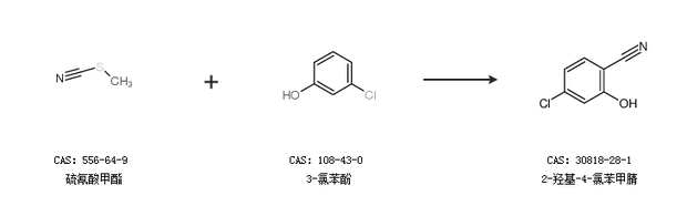 1.通过硫氰酸甲酯和3-氯苯酚合成2-羟基-4-氯苯甲腈