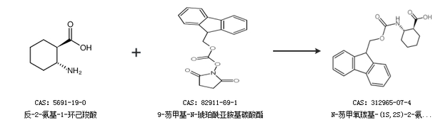 2.通过反-2-氨基-1-环己羧酸和9-芴甲基-N-琥珀酰亚胺基碳酸酯合成N-芴甲氧羰基-(1S,2S)-2-氨基环己烷羧酸