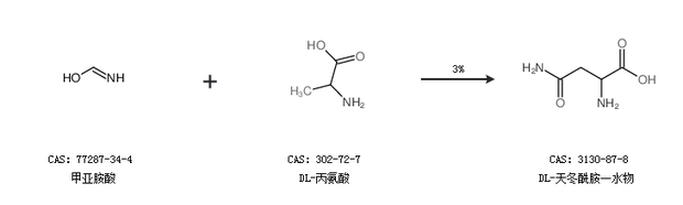 1.通过甲亚胺酸和DL-丙氨酸合成DL-天冬酰胺一水物,收率约3%;