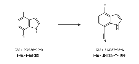 1.通过7-溴-4-氟吲哚合成4-氟-1H-吲哚-7-甲腈,收率约67%;