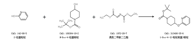 1.通过2-羟基吡啶、N-Boc-4-羟基哌啶和偶氮二甲酸二乙酯合成1-Boc-4-(2-吡啶氧基)哌啶