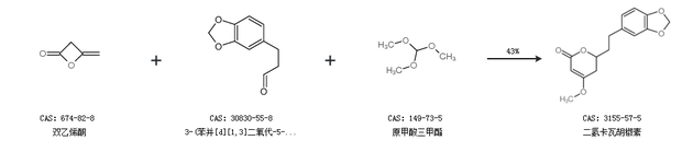 2.通过双乙烯酮、3-(苯并[d][1,3]二氧代-5-基)丙醛和原甲酸三甲酯合成二氢卡瓦胡椒素,收率约43%;