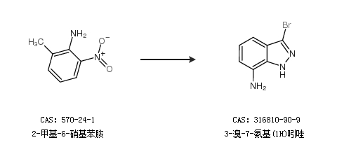 1.通过3-溴-7-硝基吲哚合成3-溴-7-氨基(1H)吲唑,收率约93%;