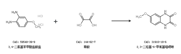 1.通过3,4-二氨基苯甲醚盐酸盐和乙二酸二乙酯合成2,3-二羟基-6-甲氧基喹噁啉,收率约70%;