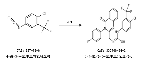 2.通过4-氯-3-三氟甲基异氰酸苯酯合成1-4-氯-3-(三氟甲基)苯基-3-3-(4-氟苯基)-4-氧代-喹唑啉-2-甲基脲,收率约99%;