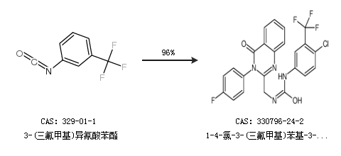 1.通过3-(三氟甲基)异氰酸苯酯合成1-4-氯-3-(三氟甲基)苯基-3-3-(4-氟苯基)-4-氧代-喹唑啉-2-甲基脲,收率约96%;