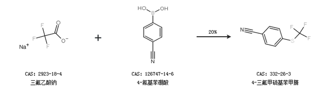 1.通过三氟乙酸钠和4-氰基苯硼酸合成4-三氟甲硫基苯甲腈,收率约20%;