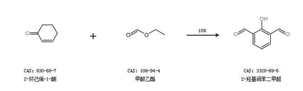 2.通过2-环己烯-1-酮和甲酸乙酯合成2-羟基间苯二甲醛,收率约10%;