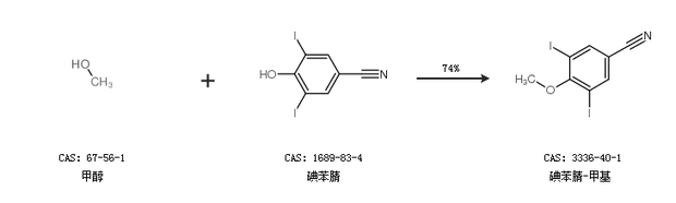 1.通过甲醇和碘苯腈合成碘苯腈-甲基,收率约74%;