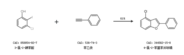 1.通过3-氯-2-碘苯酚和苯乙炔合成4-氯-2-苯基苯并呋喃,收率约61%;