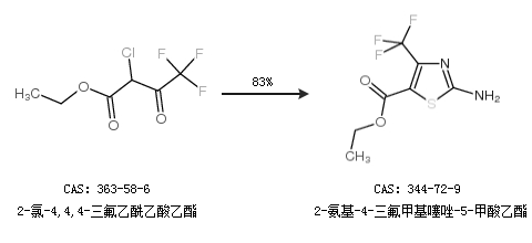 1.通过2-氯-4,4,4-三氟乙酰乙酸乙酯合成2-氨基-4-三氟甲基噻唑-5-甲酸乙酯,收率约83%;