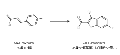 1.通过对氟肉桂酸合成3-氯-6-氟基苯并[B]噻吩-2-甲酰氯
