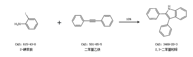 1.通过2-碘苯胺和二苯基乙炔合成2,3-二苯基吲哚,收率约10%;
