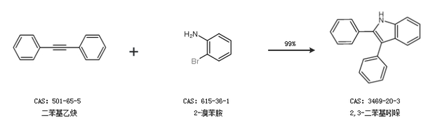 2.通过二苯基乙炔和2-溴苯胺合成2,3-二苯基吲哚,收率约99%;