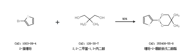 1.通过2-溴噻吩和2,2-二甲基-1,3-丙二醇合成噻吩-2-硼酸新戊二醇酯,收率约90%;