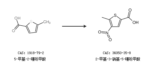 1.通过5-甲基-2-噻吩甲酸合成2-甲基-3-硝基-5-噻吩甲酸,收率约70%;