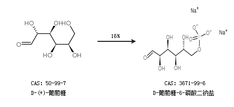 1.通过D-(+)-葡萄糖合成D-葡萄糖-6-磷酸二钠盐,收率约16%;